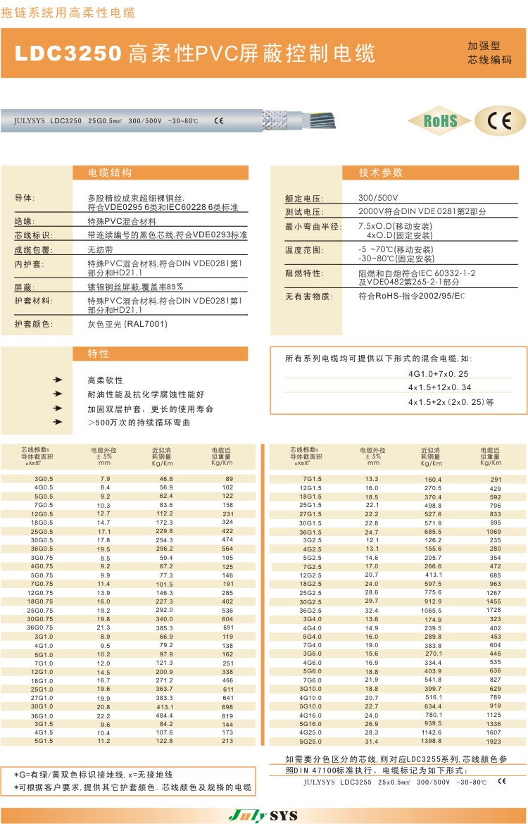 拖链系统用高柔性PVC屏蔽控制电缆(加强型) LDC3250系列
