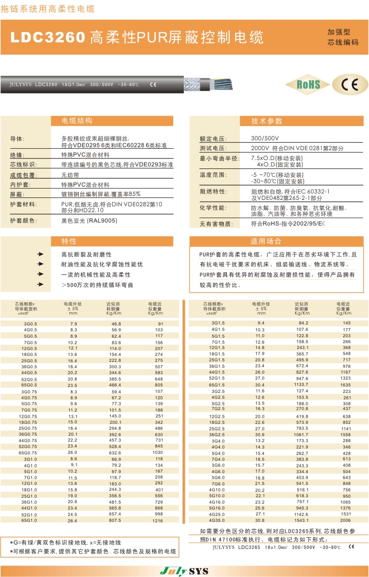 拖链系统用高柔性PUR屏蔽控制电缆(加强型)  LDC3260系列