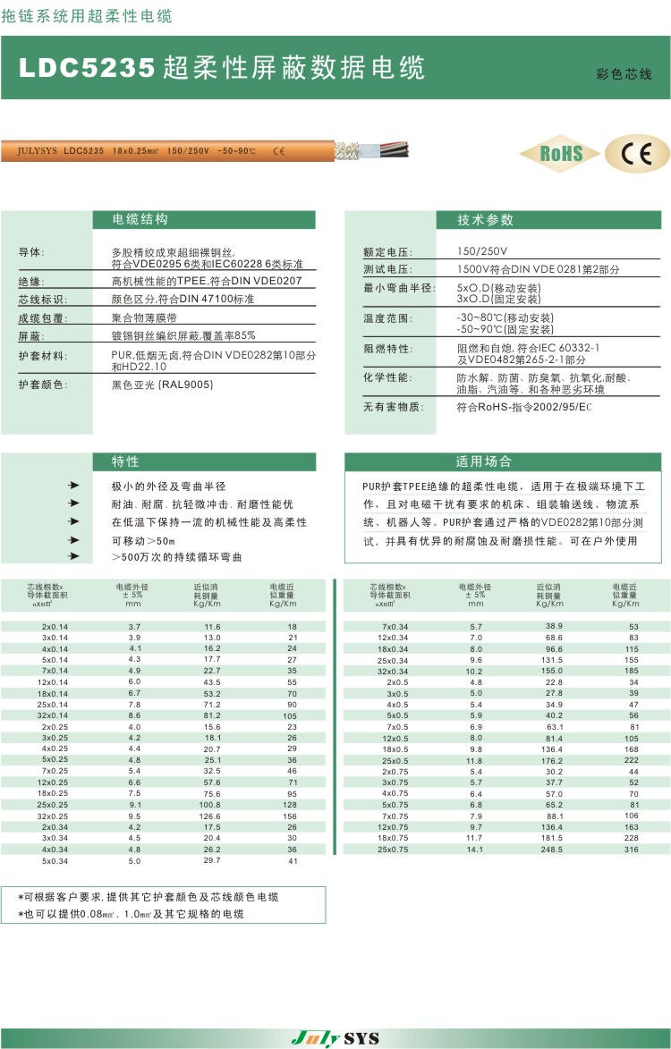 拖链系统用超柔性屏蔽数据电缆 LDC5235系列